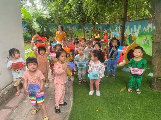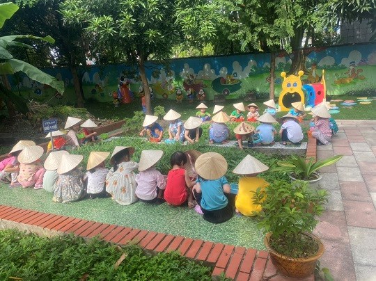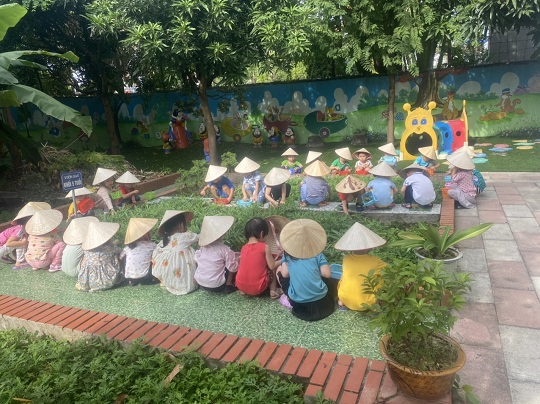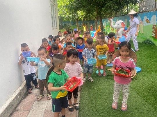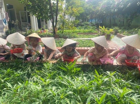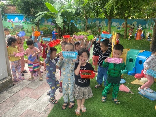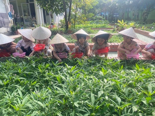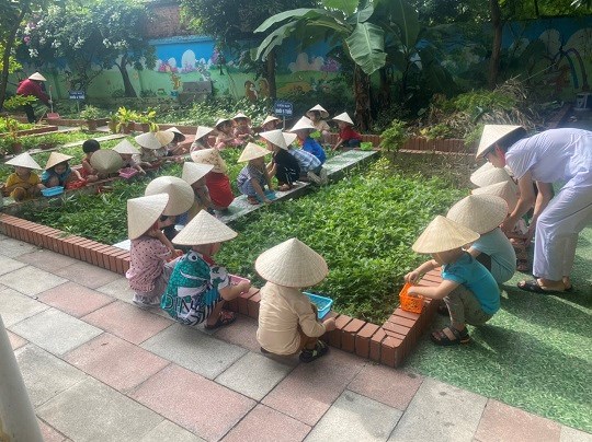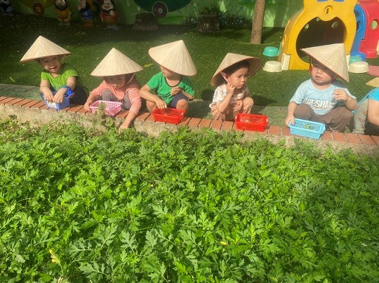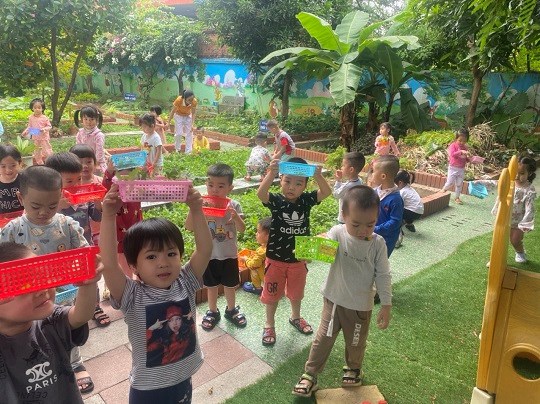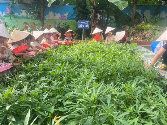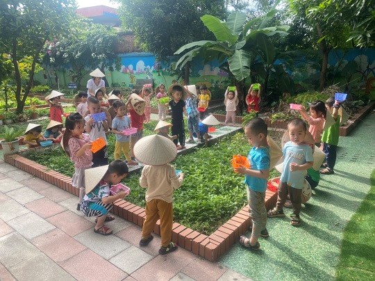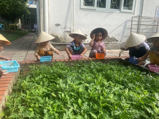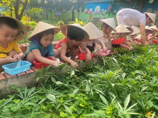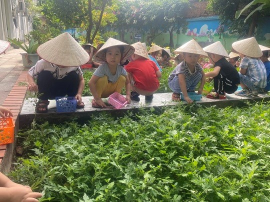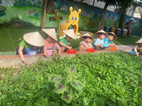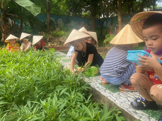 Chăm sóc cây xanh không chỉ góp phần tạo cảnh quan môi truờng "xanh - sạch - đẹp" trong nhà truờng mà còn giúp trẻ có không gian thoáng mát để vui chơi, họat động ngoài trời, được trải nghiệm và làm quen với thế giới thực vật sinh động. Giờ học ngoại khóa tại vườn truờng, các bé được tham gia hoạt động trồng trọt, quan sát cây xanh, qua đó phân biệt được các loại rau... biết chăm sóc và thu hoạch cây trồng, đồng thời nhận thức được lợi ích của việc trồng rau sạch đối với môi trường sống xung quanh.