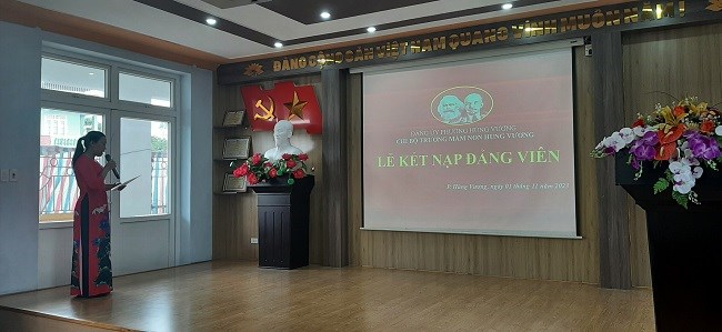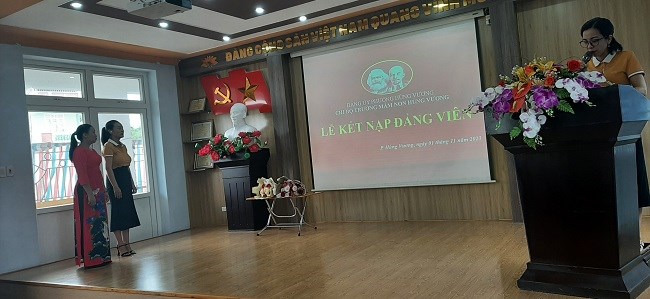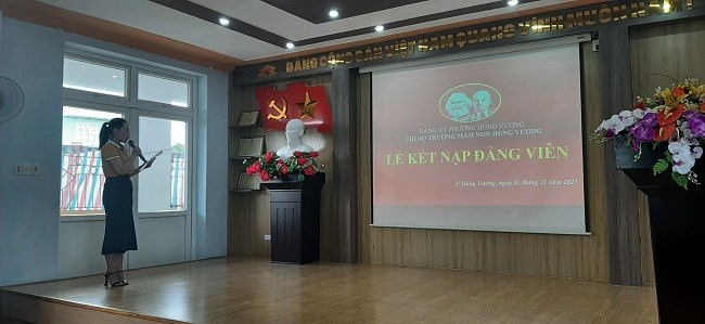 Lễ kết nạp đảng viên được diễn ra trong không khí trang nghiêm, theo quy định của Điều lệ Đảng. Sau phần nghi thức, đ/c Vũ Thị Thu Hà – Bí thư Chi bộ, Hiệu trưởng nhà trường đã công bố Quyết định kết nạp đảng viên của Quận uỷ Hồng Bàng và tặng hoa chúc mừng 02 đồng chí. Trước sự chứng kiến của Chi bộ, 02 đồng chí đảng viên mới đã tuyên thệ, nguyện quyết tâm phấn đấu để luôn xứng đáng là người đảng viên gương mẫu, đóng góp sức mình thực hiện thành công nhiệm vụ chính trị.