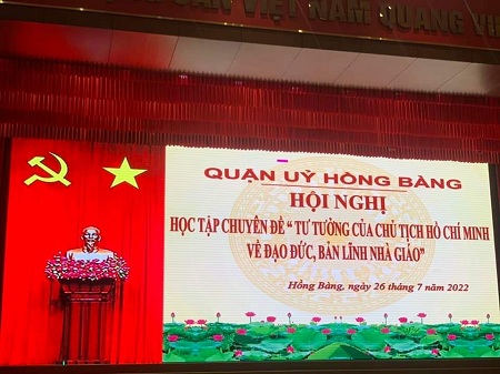 Sáng 26/7/2022, Quận ủy Hồng Bàng tổ chức Hội nghị học tập chuyên đề “Tư tưởng của Chủ tịch Hồ Chí Minh về đạo đức, bản lĩnh nhà giáo” cho cán bộ quản lí, giáo viên, nhân viên ngành giáo dục toàn quận.