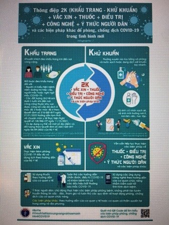 Để chủ động phòng, chống dịch COVID-19. Bộ Y tế gửi đến người dân thông điệp phòng, chống dịch COVID-19 trong tình hình mới, với các biện pháp: 2K (Khẩu trang, Khử khuẩn) + vắc xin + thuốc + điều trị + công nghệ + ý thức người dân và các biện pháp khác.