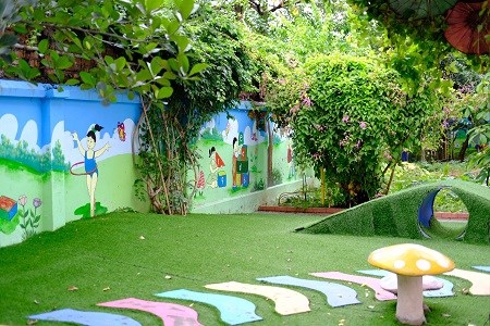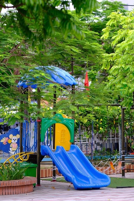 Dưới bóng cây là các đồ chơi ngoài trời để các bé thỏa sức vui chơi