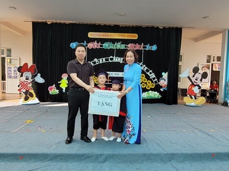 Các bé rất vinh dự được đón Bác Phạm Văn Đoan - Ban thường vụ quận ủy - Phó Chủ tịch UBND , bác Nguyễn Thị Vân Anh - Trưởng phòng Giáo dục và Đào tạo quận Hồng Bàng đến tặng quà.