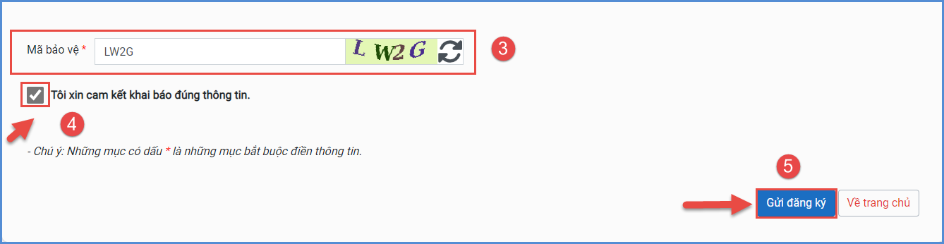 Sau khi hoàn thiện hồ sơ học sinh, PHHS nhập Mã bảo vệ, tích Tôi xin cam kết khai báo đúng thông tin và [Gửi đăng ký] để gửi hồ sơ của HS về trường đăng ký tuyển sinh.