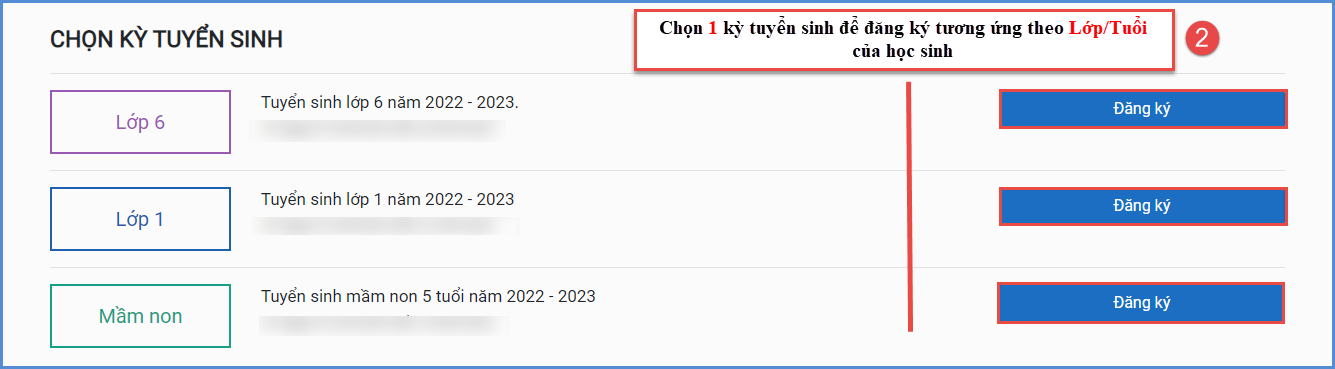 Bước 4: Chọn [Đăng ký tuyển sinh], giao diện hiển thị các kỳ tuyển sinh, PHHS chọn kỳ tuyển sinh cần đăng ký, nhấn nút [Đăng Ký].